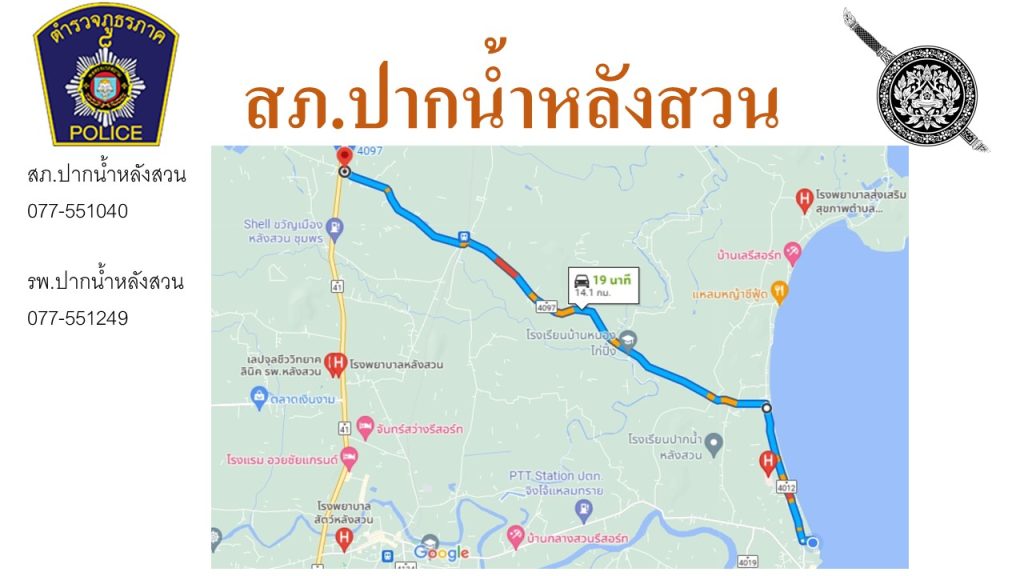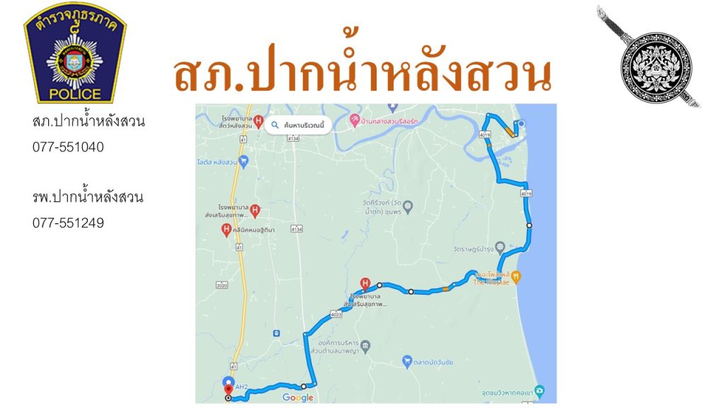 ประชาสัมพันธ์ เนื่องในเทศกาลปีใหม่ 2567 ตำรวจภูธรจังหวัดชุมพรได้กำหนดแผนบูรณาการป้องกันและลดอุบัติเหตุทางถนนช่วงเทศกาลปีใหม่ 2567 ภายใต้ชื่อการรณรงค์ “ชีวิตวิถีใหม่ ขับขี่อย่างปลอดภัย ไร้อุบัติเหตุ “โดย สภ.ปากน้ำหลังสวน กำหนดแผนที่แสดงเส้นทางหลัก เส้นทางรองในพื้นที่ ตำบลปากน้ำ ตำบลบางมะพร้าวและตำบลบางน้ำจืด เพื่อให้การเดินทางของพี่น้องประชาชนเกิดความสะดวกรวดเร็วและถึงที่หมายโดยปลอดภัย จึงขอแนะนำเส้นทางจากถนนสายหลัก(41)เดินทางไปยังชายหาดปากน้ำหลังสวน 3 เส้นทาง 1.เดินทาง จาก กทม.ลงใต้ เลี้ยวเข้าสาย 4097 ที่ หลัก กม.ที่ 57 2.เดินทาง จาก.ใต้ ขึ้น กทม. เลี้ยวเข้าสาย ชพ.3230 ที่ หลัก กม.ที่ 74 3.เดินทางจากสี่แยกไฟแดง สวนศรีนครินทร์(หลังสวน) ผ่านตลาดหลังสวน ใช้เส้นทางสาย 4002 🙏🙏🙏ด้วยความปรารถนาดีจาก สถานีตำรวจภูธรปากน้ำหลังสวน