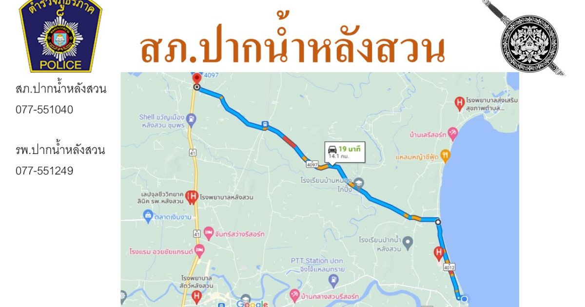ประชาสัมพันธ์ เนื่องในเทศกาลปีใหม่ 2567 ตำรวจภูธรจังหวัดชุมพรได้กำหนดแผนบูรณาการป้องกันและลดอุบัติเหตุทางถนนช่วงเทศกาลปีใหม่ 2567 ภายใต้ชื่อการรณรงค์ “ชีวิตวิถีใหม่ ขับขี่อย่างปลอดภัย ไร้อุบัติเหตุ “โดย สภ.ปากน้ำหลังสวน กำหนดแผนที่แสดงเส้นทางหลัก เส้นทางรองในพื้นที่ ตำบลปากน้ำ ตำบลบางมะพร้าวและตำบลบางน้ำจืด เพื่อให้การเดินทางของพี่น้องประชาชนเกิดความสะดวกรวดเร็วและถึงที่หมายโดยปลอดภัย จึงขอแนะนำเส้นทางจากถนนสายหลัก(41)เดินทางไปยังชายหาดปากน้ำหลังสวน 3 เส้นทาง 1.เดินทาง จาก กทม.ลงใต้ เลี้ยวเข้าสาย 4097 ที่ หลัก กม.ที่ 57 2.เดินทาง จาก.ใต้ ขึ้น กทม. เลี้ยวเข้าสาย ชพ.3230 ที่ หลัก กม.ที่ 74 3.เดินทางจากสี่แยกไฟแดง สวนศรีนครินทร์(หลังสวน) ผ่านตลาดหลังสวน ใช้เส้นทางสาย 4002 🙏🙏🙏ด้วยความปรารถนาดีจาก สถานีตำรวจภูธรปากน้ำหลังสวน