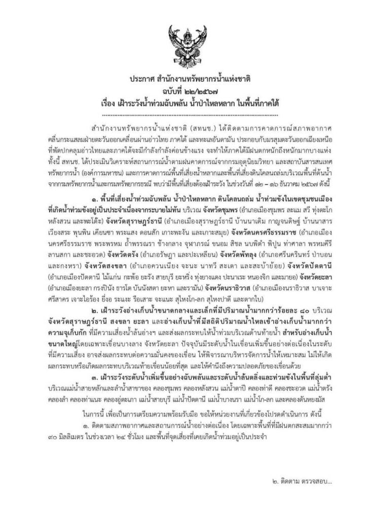 สำนักงานทรัพยากรน้ำแห่งชาติ (สทนช.) ได้ติดตามการคาดการณ์สภาพอากาศ คลื่นกระแสลมฝ่ายตะวันออกเคลื่อนผ่านอ่าวไทย ภาคใต้ และทะเลอันดามัน ประกอบกับมรสุมตะวันออกเฉียงเหนือที่พัดปกคลุมอ่าวไทยและภาคใต้จะมีกำลังกำลังค่อนข้างแรง จะทำให้ภาคใต้มีฝนตกหนักถึงหนักมากบางแห่ง ทั้งนี้ สทนช. ได้ประเมินวิเคราะห์สถานการณ์น้ำตามฝนคาดการณ์จากกรมอุตุนิยมวิทยา และสถาบันสารสนเทศทรัพยากรน้ำ (องค์การมหาชน) และการคาดการณ์พื้นที่เสี่ยงน้ำหลากและพื้นที่เสี่ยงดินโคลนถล่มบริเวณพื้นที่ต้นน้ำ จากกรมทรัพยากรน้ำและกรมทรัพยากรธรณี พบว่ามีพื้นที่เสี่ยงต้องเฝ้าระวัง ในช่วงวันที่ 12 – 16 ธันวาคม 2567 ดังนี้