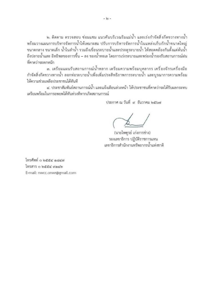 2. ติดตาม ตรวจสอบ ซ่อมแซม แนวคันบริเวณริมแม่น้ำ และเร่งกำจัดสิ่งกีดขวางทางน้ำ พร้อมวางแผนการบริหารจัดการน้ำให้เหมาะสม ปรับการบริหารจัดการน้ำในแหล่งเก็บกักน้ำขนาดใหญ่ ขนาดกลาง ขนาดเล็ก น้ำในลำน้ำ รวมถึงเขื่อนระบายน้ำและประตูระบายน้ำ ให้สอดคล้องกันตั้งแต่ต้นน้ำถึงปลายน้ำและ อิทธิพลของการขึ้น – ลง ของน้ำทะเล โดยการเร่งระบายและพร่องน้ำรองรับสถานการณ์ฝนที่คาดว่าจะตกหนัก