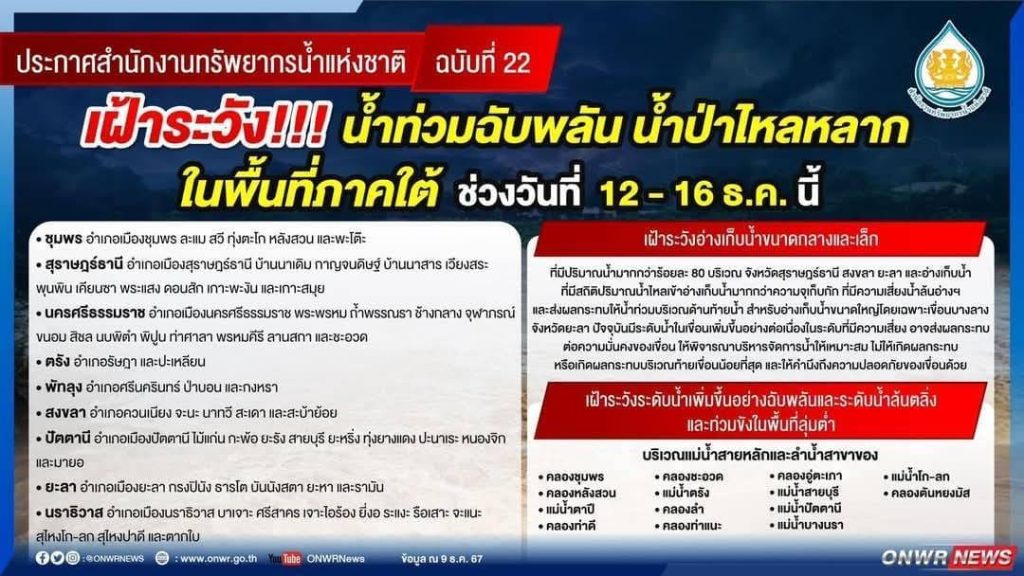 #เฝ้าระวังน้ำท่วมฉับพลัน น้ำป่าไหลหลาก ในพื้นที่ภาคใต้