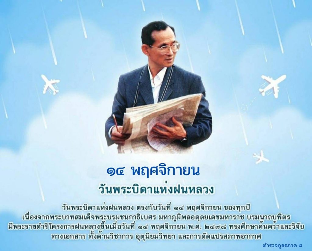 วันพระบิดาแห่งฝนหลวง 14 พฤศจิกายน 2567 โดย Pol.Admid / ข่าวประชาสัมพันธ์,ข่าวฝากประชาสัมพันธ์ 14 พฤศจิกายน 2567 “วันพระบิดาแห่งฝนหลวง” เป็นวันที่พระบาทสมเด็จพระบรมชนกาธิเบศร มหาภูมิพลอดุลยเดชมหาราช บรมนาถบพิตร รัชกาลที่ 9 ทรงมีพระราชดำริโครงการฝนหลวงขึ้น เพื่อแก้ไขภัยแล้งให้พสกนิกรชาวไทย สำนึกในพระมหากรุณาธิคุณอันหาที่สุดมิได้ #14พฤศจิกายน #วันพระบิดาแห่งฝนหลวง #โครงการของพ่อ #ฝนหลวงฝนแรกที่โคราช #ตำรวจภูธรภาค8 Post Views: 51 FacebookFacebookXXLINELine
