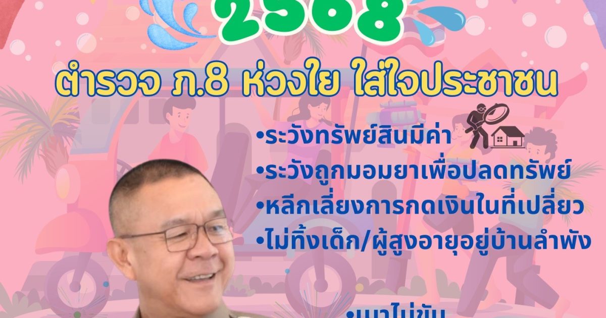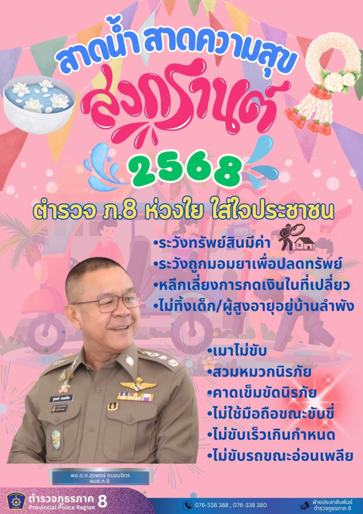 สาดน้ำ สาดความสุข สงกรานต์ 2568 1 เมษายน 2568 โดย Pol.Admid / ข่าวประชาสัมพันธ์ สาดน้ำ สาดความสุข พล.ต.ท.สุรพงษ์ ถนอมจิตร ผบช.ภ.8 ได้มีความห่วงใยพี่น้องประชาชนที่จะเดินทางกลับภูมิลำเนาหรือท่องเที่ยวตามสถานที่ต่างๆ ในช่วงเทศกาลสงกรานต์ โดยเฉพาะเรื่องของความปลอดภัยและความสะดวกในการจราจร ตลอดจนความปลอดภัยในชีวิตและทรัพย์สินของพี่น้องประชาชนจากอาชญากรรมรูปแบบต่างๆ ทั้งนี้ขอให้ท่านและครอบครัวเดินทางปลอดภัย และปฏิบัติตามกฎจราจรอย่างเคร่งครัด ด้วยความห่วงใยจากตำรวจภูธรภาค 8 Post Views: 21 FacebookFacebookXXLINELine