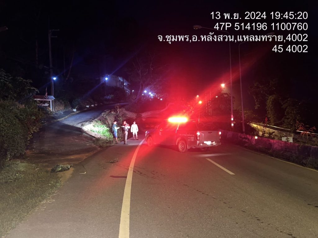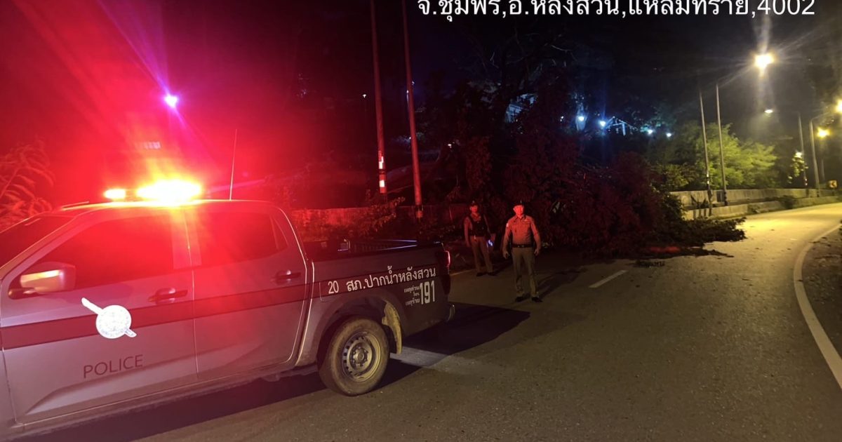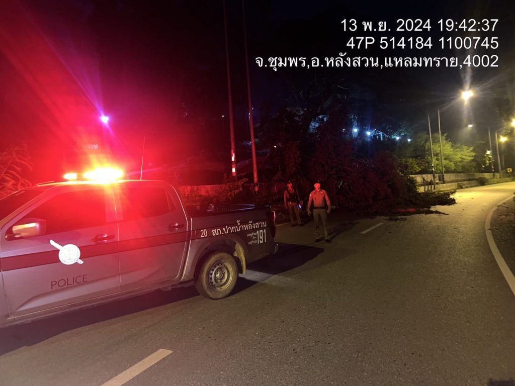 อำนวยความสะดวกเปิดสัญญาณไฟวับวาบเพื่อป้องกันอุบัติเหตุ ต้นไม้ใหญ่ล้มขวางถนนทำให้ส่งผลต่อการจราจรผ่านไปมา